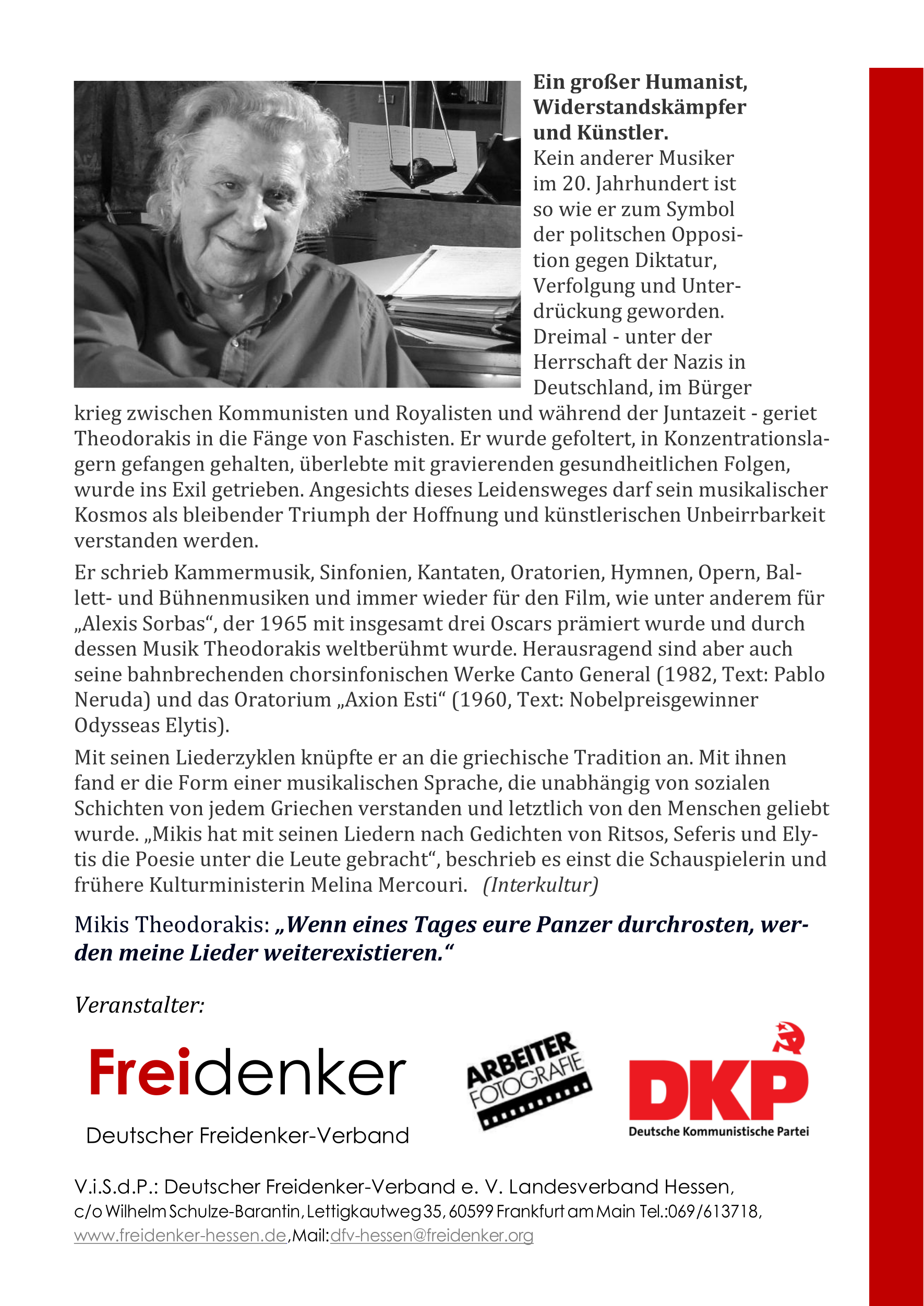 Kein anderer Musiker im 20. Jahrhundert ist so wie er zum Symbol der politischen Opposition gegen Diktatur, Verfolgung und Unterdrückung geworden. Dreimal – unter der Herrschaft der Nazis in Deutschland, im Bürgerkrieg zwischen Kommunisten und Royalisten und während der Juntazeit – geriet Theodorakis in die Fänge von Faschisten. Er wurde gefoltert, in Konzentrationslagern gefangen gehalten, überlebte mit gravierenden gesundheitlichen Folgen, wurde ins Exil getrieben. Angesichts dieses Leidensweges darf sein musikalischer Kosmos als bleibender Triumph der Hoffnung und künstlerischen Unbeirrbarkeit verstanden werden. Er schrieb Kammermusik, Sinfonien, Kantaten, Oratorien, Hymnen, Opern, Ballett- und Bühnenmusiken und immer wieder für den Film, wie unter anderem für „Alexis Sorbas“, der 1965 mit insgesamt drei Oscars prämiert wurde und durch dessen Musik Theodorakis weltberühmt wurde.