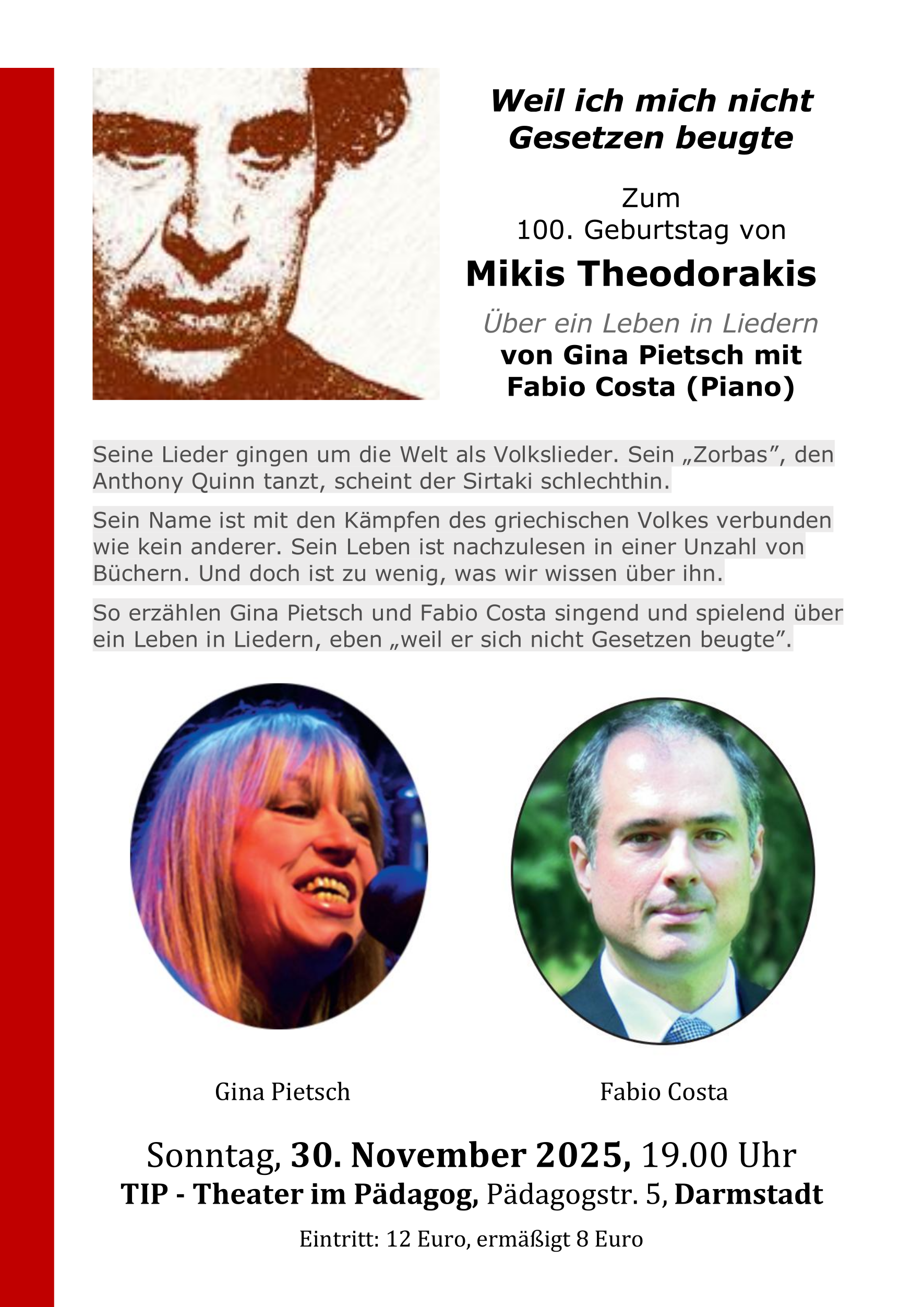 Mikis Theodorakis’ Lieder gingen um die Welt als Volkslieder. Sein „Zorbas”, den Anthony Quinn tanzt, scheint der Sirtaki schlechthin. Sein Name ist mit den Kämpfen des griechischen Volkes verbunden wie kein anderer. Sein Leben ist nachzulesen in einer Unzahl von Büchern. Und doch ist zu wenig, was wir wissen über ihn. So erzählen Gina Pietsch und Fabio Costa singend und spielend über ein Leben in Liedern, eben „weil er sich nicht Gesetzen beugte”.